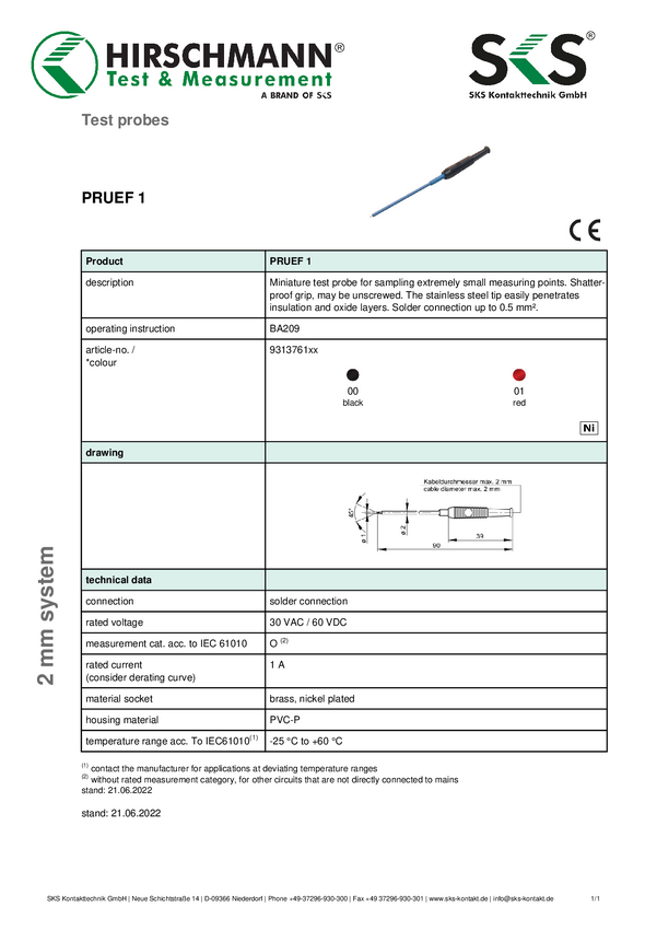 Końcówka pomiarowa; PRUEF 2 / 973368101; czerwony; 2mm; wtykany (gniazdo bananowe 4mm); 60V; 97,5mm; PP; HIRSCHMANN; RoHS