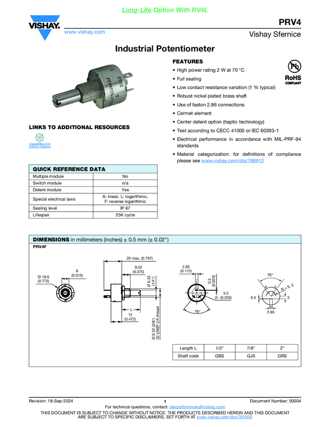 Fully Sealed Potentiometer Cermet or Conductive Plastic