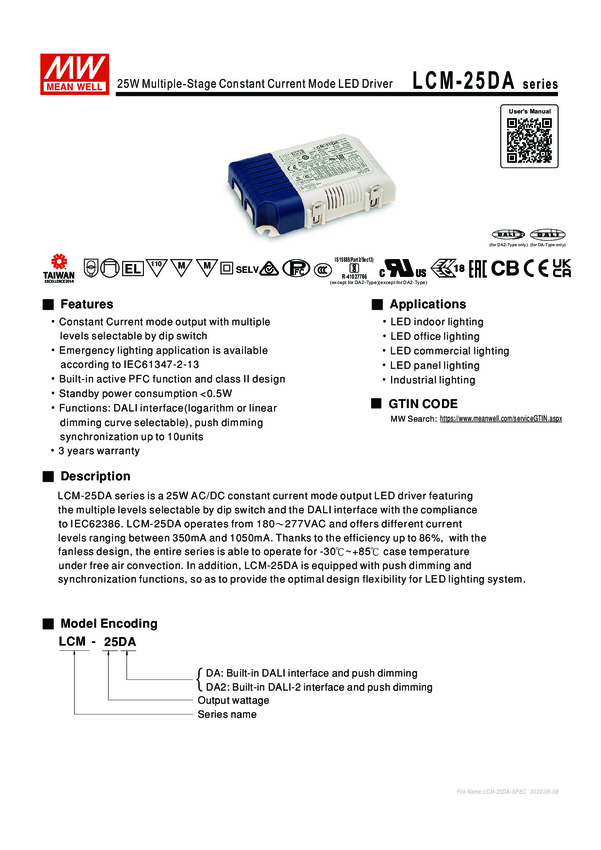MEAN WELL LCM-25DA Sterownik LED Stałonaprądowy 25 W 0.35 - 1.05 A 6 - 54 V/DC Ściemniacz, Układ PFC, Zabezpieczenie prz