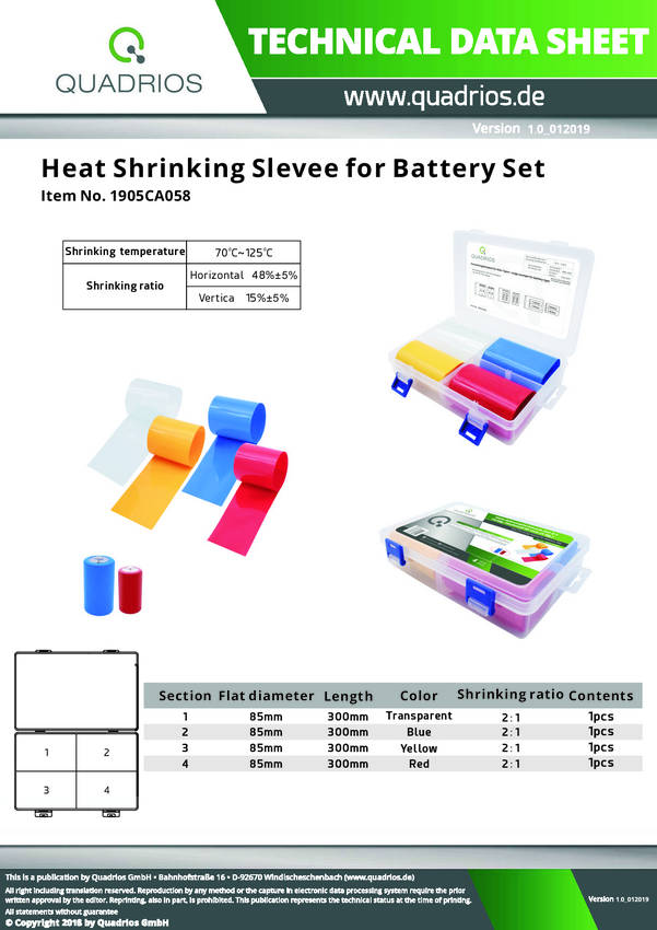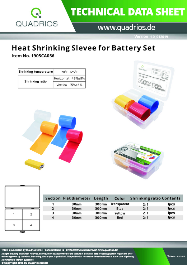 Quadrios 1905CA058 Rurka termokurczliwa do akumulatorów bez kleju przeźroczysty, niebieski, żółty, czerwony 54 mm 28 mm