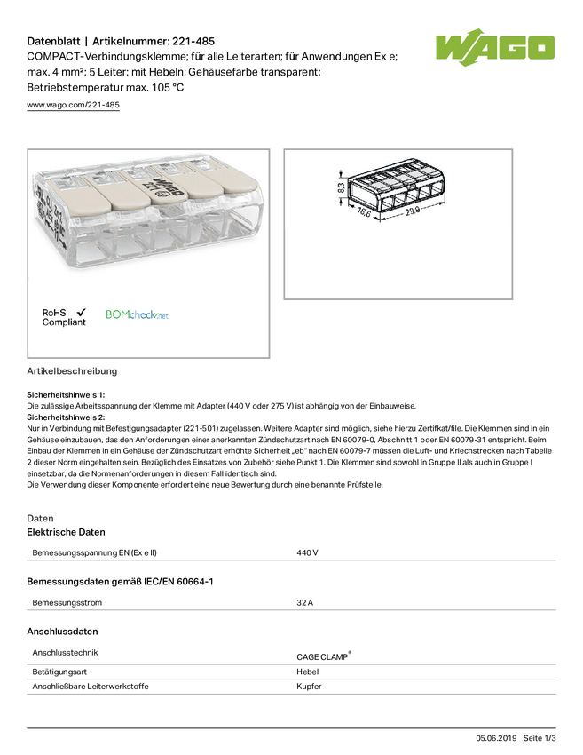 WAGO 221-485 Złącze zaciskowe elastyczny: 0.20-4 mm² stała: 0.20-4 mm² Ilość styków: 5 1 szt. przeźroczysty, biały