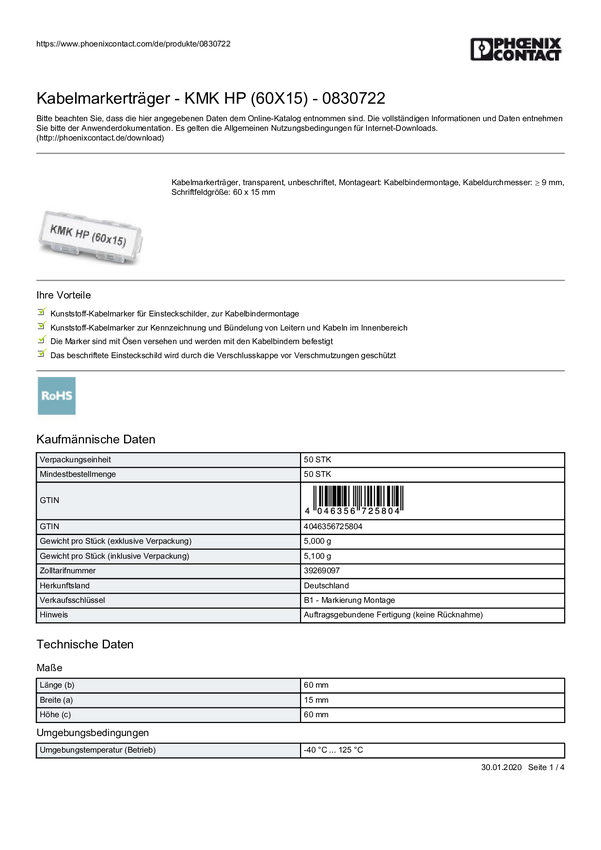 Phoenix Contact 0830722 KMK HP (60X15) Uchwyt identyfikatora Sposób montażu: opaska kablowa przeźroczysty 50 szt.