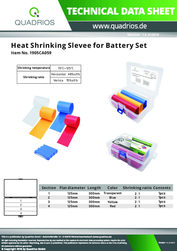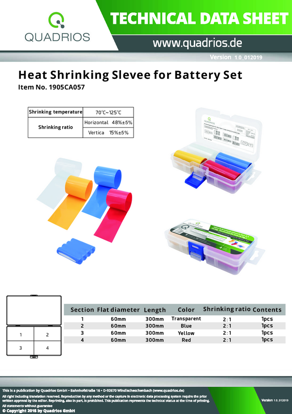 Quadrios 1905CA057 Rurka termokurczliwa do akumulatorów bez kleju przeźroczysty, niebieski, żółty, czerwony 36 mm 19 mm