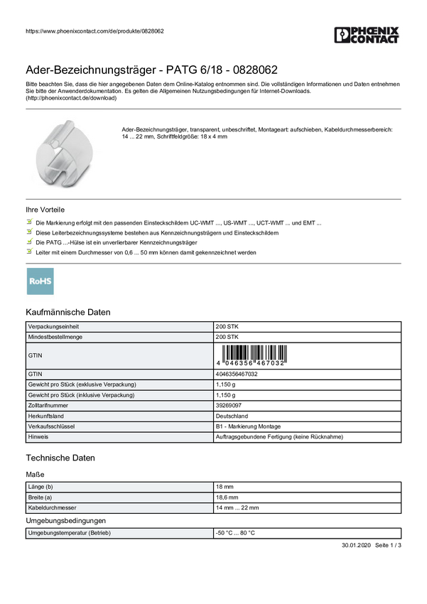 Phoenix Contact 0828062 PATG 6/18 Uchwyt identyfikatora Sposób montażu: wpychanie przeźroczysty 200 szt.