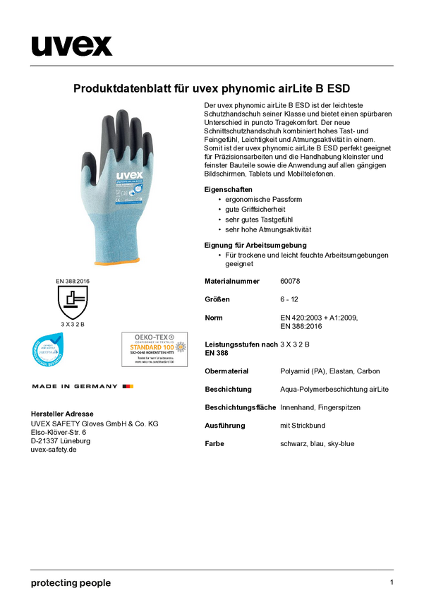 uvex phynomic 6008106 Polimer Rękawice chroniące przed przecięciem Rozmiar rękawic: 6 EN 388 1 par(a)