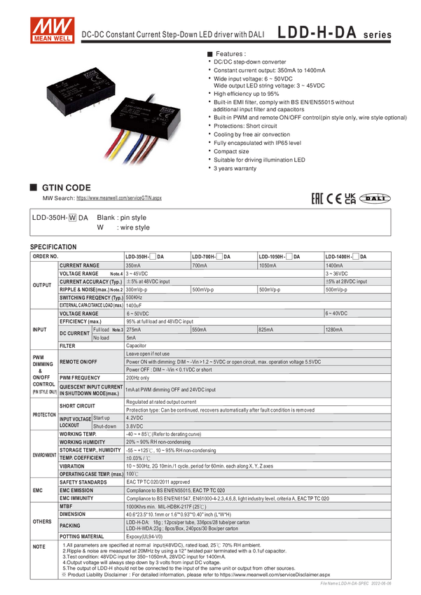 MEAN WELL LDD-700H-DA Sterownik LED Stałonaprądowy 700 mA 3 - 45 V/DC Ściemniacz, Dali, Zabezpieczenie przed przeciążeni