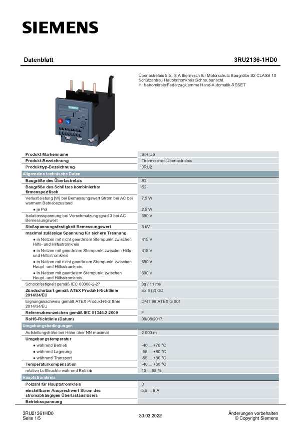 Przekaźnik przeciążeniowy Siemens 3RU2136-1HB0, 690 V/AC, 1 szt.