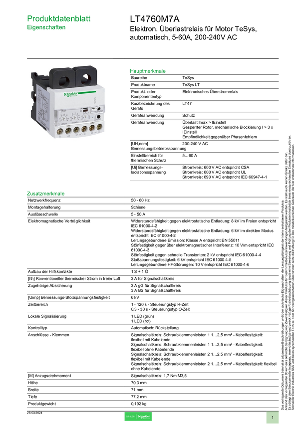 Schneider Electric LT4760M7A Przekaźnik przeciążeniowy, 1 szt.