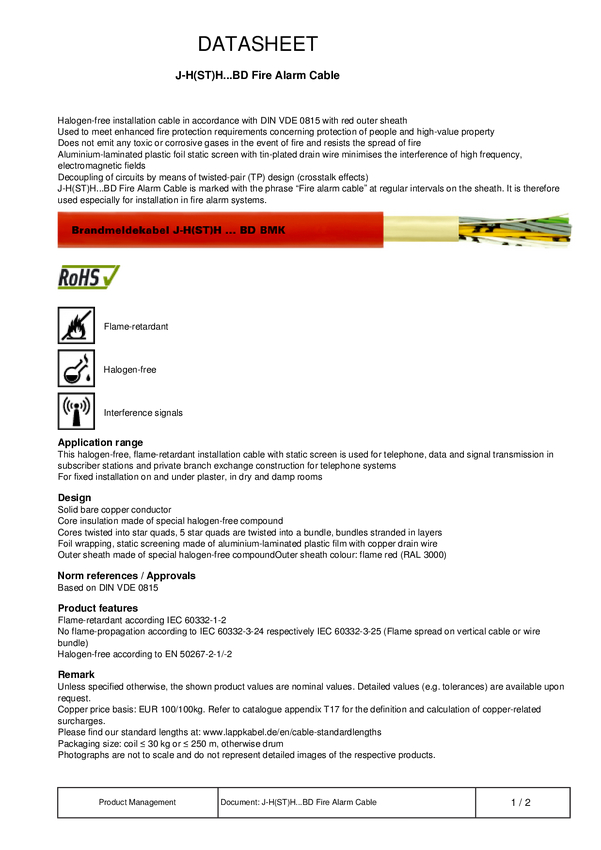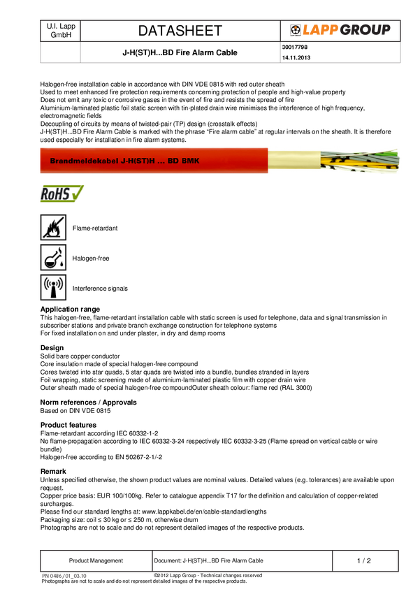 LAPP 30017798/500 Kabel przeciwpożarowy J-H(St)H 2 x 2 x 0.8 mm czerwony 500 m