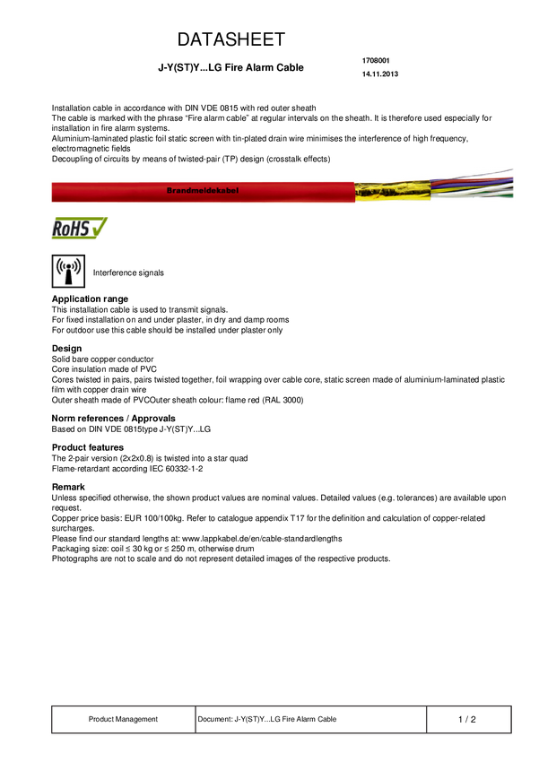 LAPP 1708001/100 Kabel przeciwpożarowy J-Y(ST)Y 1 x 2 x 0.8 mm czerwony 100 m