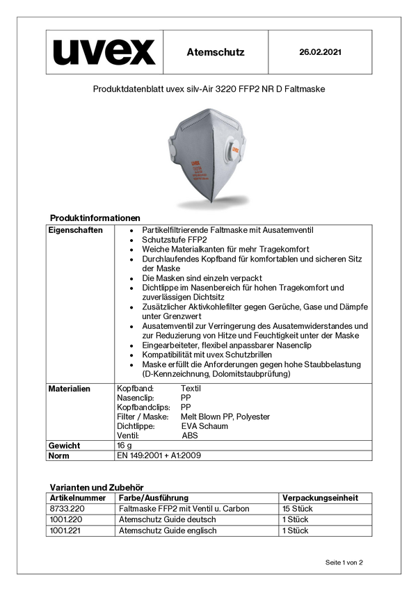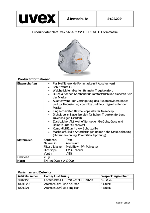 uvex silv-Air c 8733220 Maska przeciwpyłowa z wywietrznikiem FFP2 15 szt. EN 149:2001 DIN 149:2001