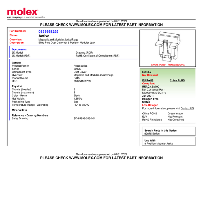 Molex Osłona przeciwpyłowa Ilość pinów 8 859993255 1 szt. torba