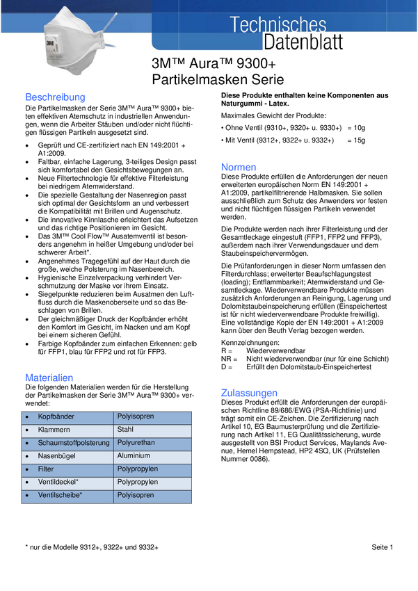 3M Aura 9320D+ Maska przeciwpyłowa bez wywietrznika FFP2 1 szt. EN 149:2001 + A1:2009 DIN 149:2001 + A1:2009