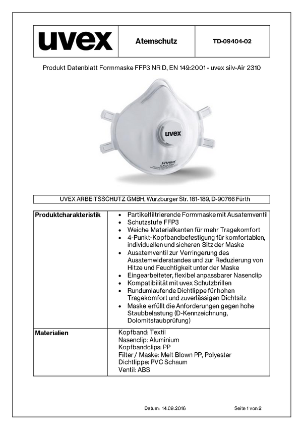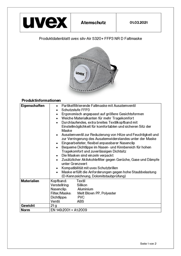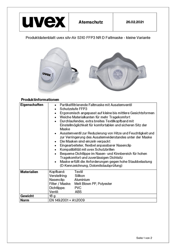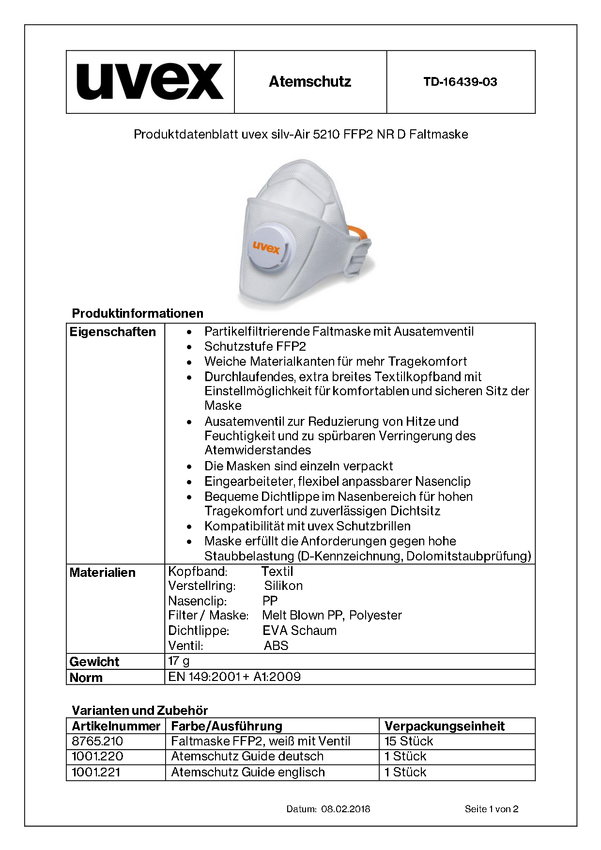 uvex silv-Air c 8732220 Maska przeciwpyłowa z wywietrznikiem FFP2 15 szt. EN 149:2001 DIN 149:2001