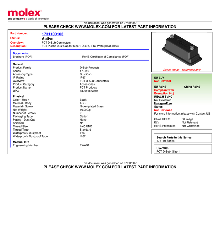 Molex 1731100103 Molex MOL Power & Signal Sol. Osłona przeciwpyłowa czarny 1 szt. karton