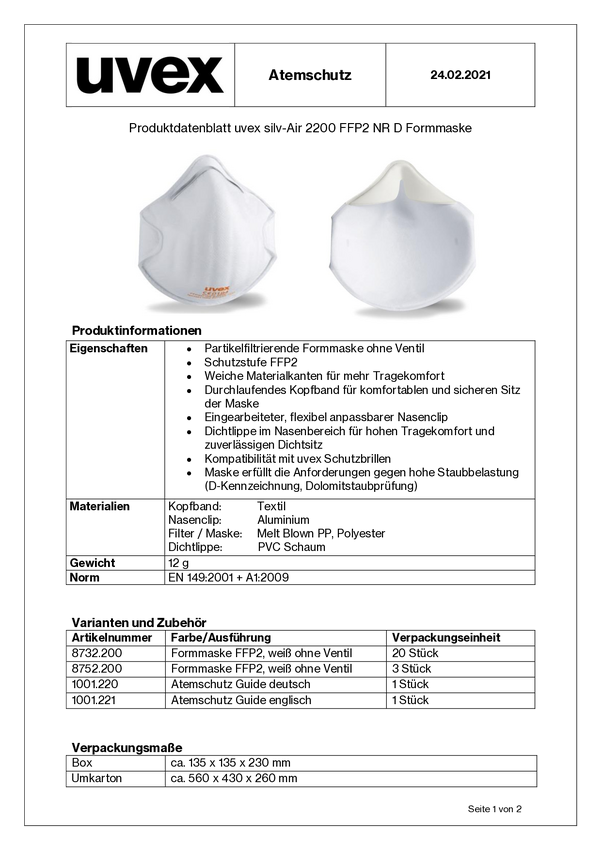 uvex silv-air classic 2200 8732200 Maska przeciwpyłowa bez wywietrznika FFP2 20 szt.