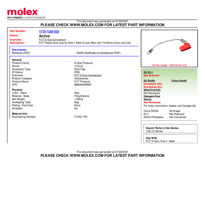 Molex 1731120103 Molex MOL Power & Signal Sol. Osłona przeciwpyłowa czerwony 1 szt.