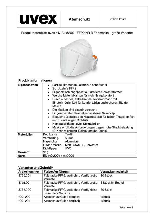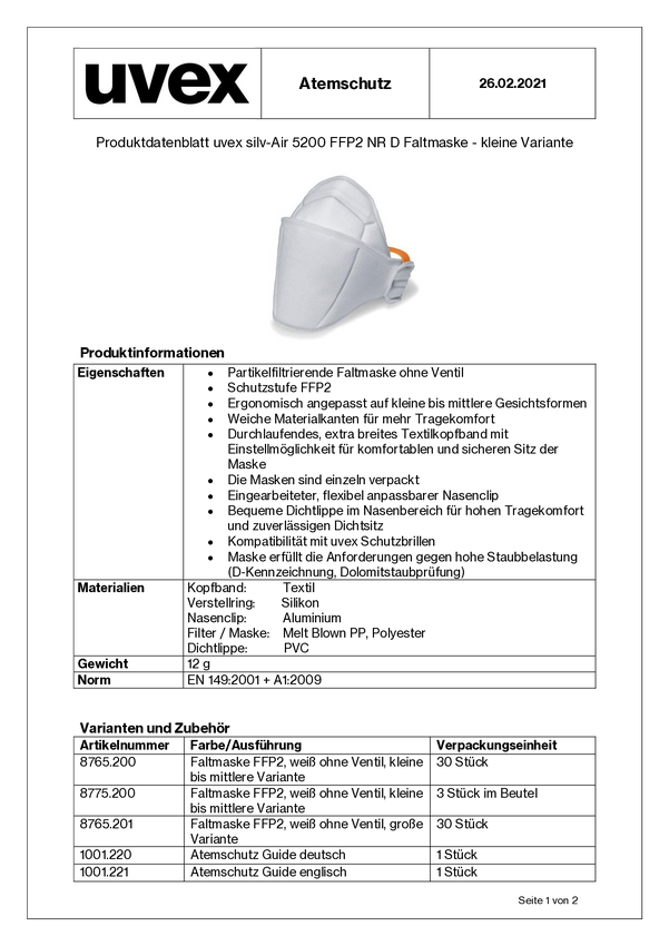 uvex silv-Air 5200+ 8765201 Maska przeciwpyłowa bez wywietrznika FFP2 30 szt.