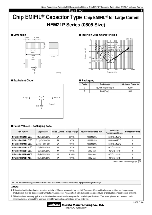 Filtr; przeciwzakłóceniowy; ceramiczny; NFM21PC105B1C3D; SMD; 0805; 4A; 16V DC; 20%; 1uF; MURATA; RoHS; op/100szt