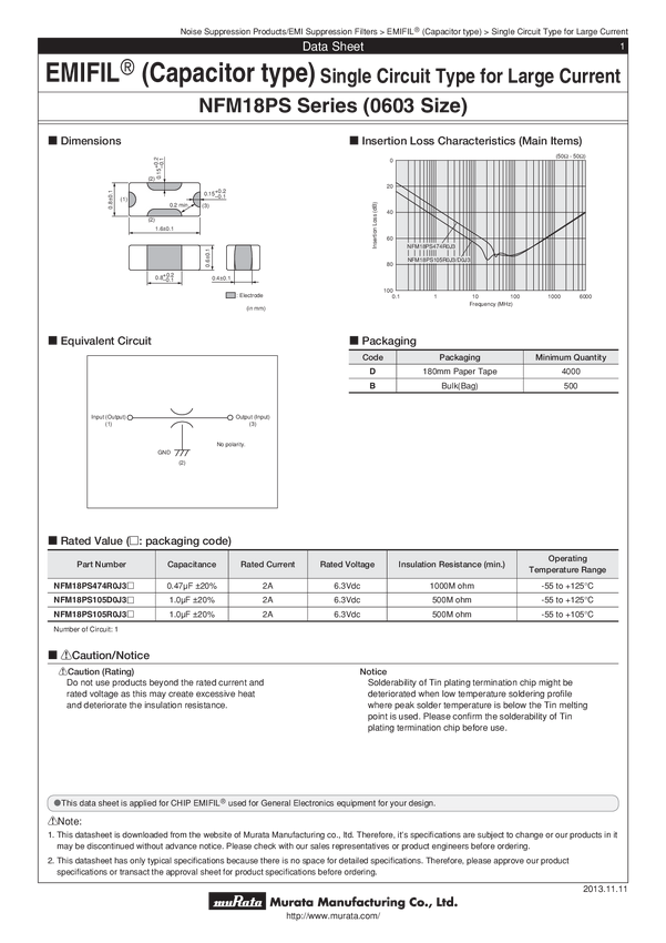 Filtr; przeciwzakłóceniowy; ceramiczny; NFM18PS105R0J3D; SMD; 0603; 2A; 6,3V DC; 20%; 1uF; MURATA; RoHS; op/100szt