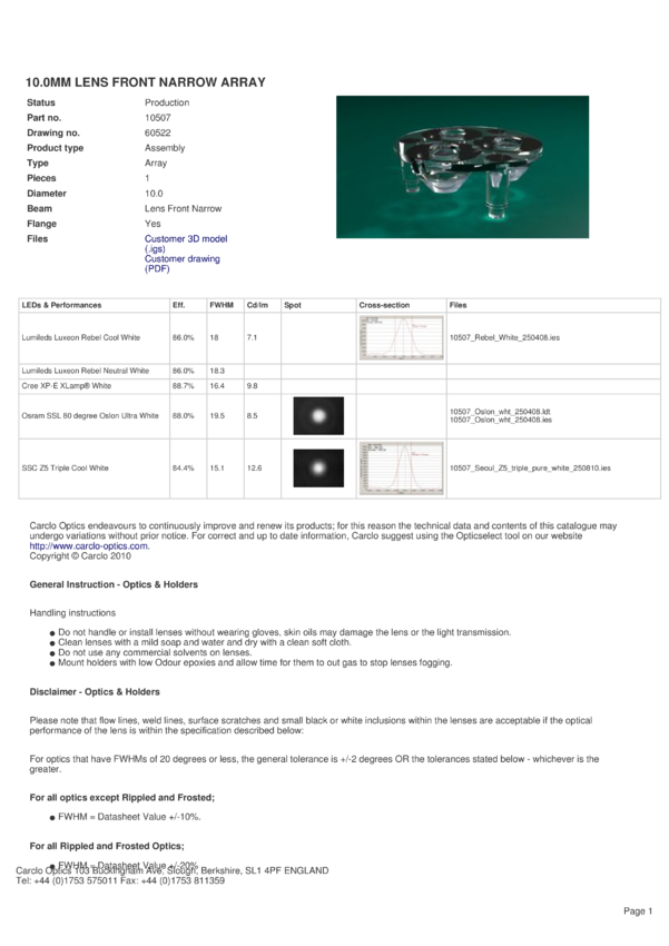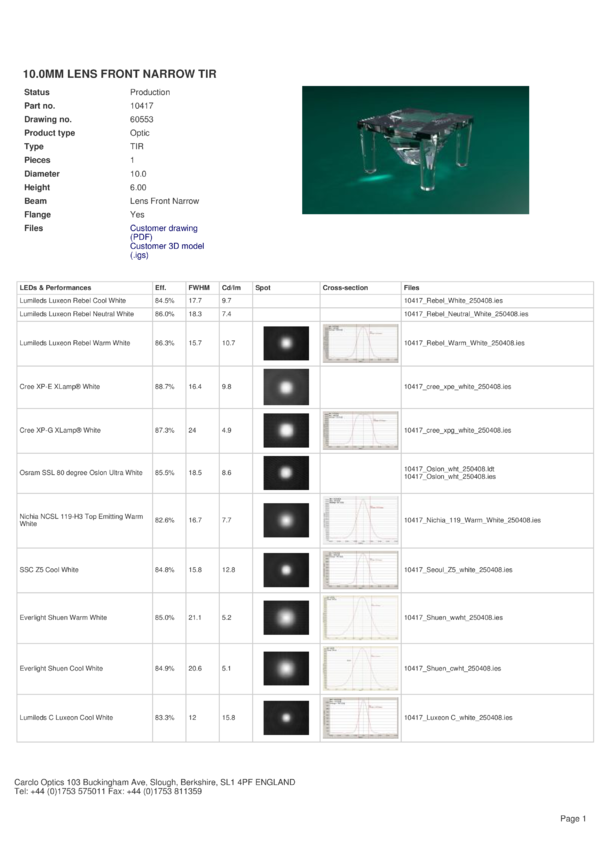 Soczewka Carclo 10417, wąska, przednia, do diod Cree serii XP, XT-E, śr:10mm, wys:6mm, FWHM(XP-E):16,4&deg FWHM(XP-G):24&deg