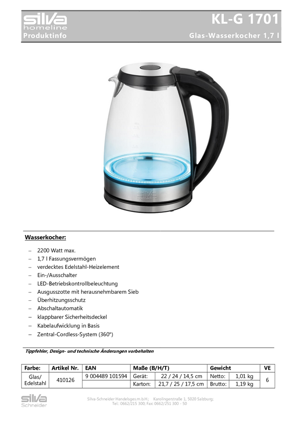 Silva Homeline KL-G 1701 Czajnik bezprzewodowy, ochrona przed przegrzaniem przeźroczysty, stali szlachetnej Pojemność: 1