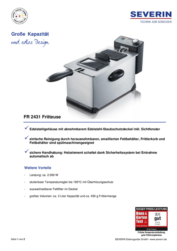 Severin FR 2431 Frytkownica 3 l 2000 W ochrona przed przegrzaniem stali szlachetnej (szczotkowanej)