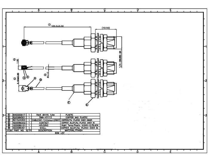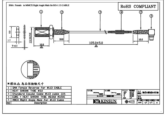 Przewód antenowy, przejściowy, RG1.13 - 105mm, zakończony , długości przewodu 105mm