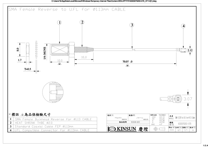 Przewód antenowy, przejściowy RG1.13 - 70mm, zakończony , przewód o długości 70mm, współpracuje z gniazdem męskim RF-IPX125