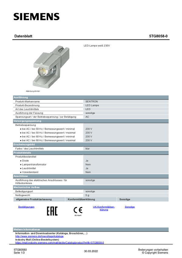 Siemens 5TG8058-0 Dioda LED przejrzysty 230 V/AC 5 szt.