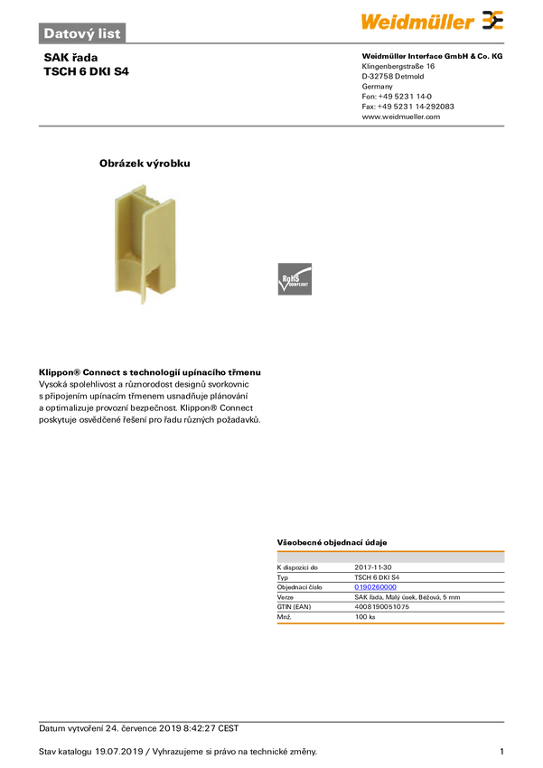 Przekładka Weidmüller TSCH 6 DKI S4 0190260000, 100 szt.