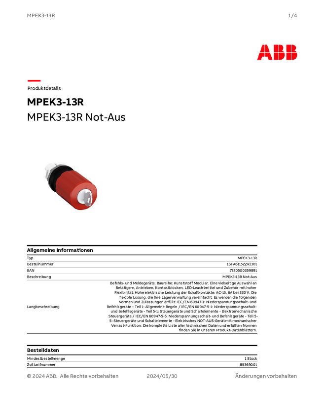 ABB 1SFA611525R1301 MPEK4-13R Przycisk zatrzymania awaryjnego czerwony przekręcenie klucza 1 szt.