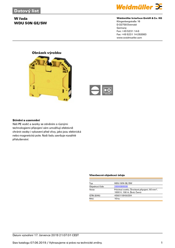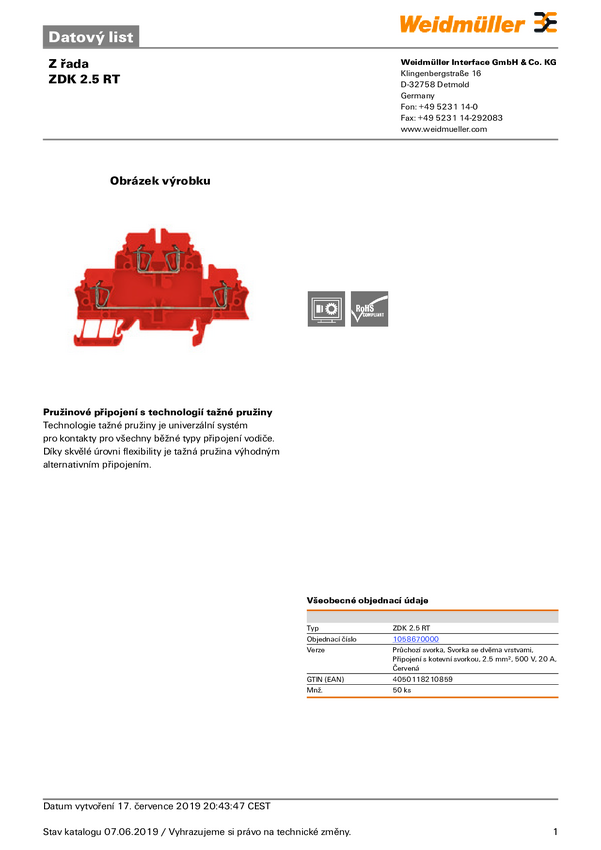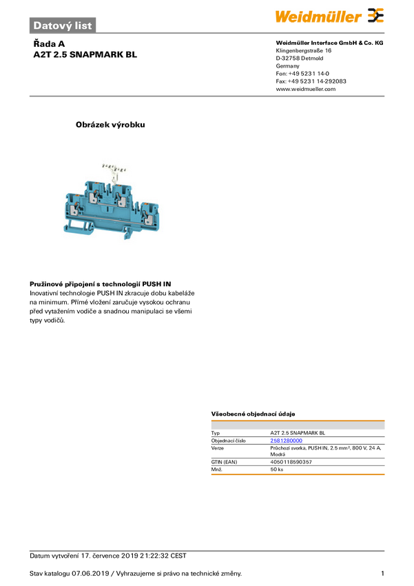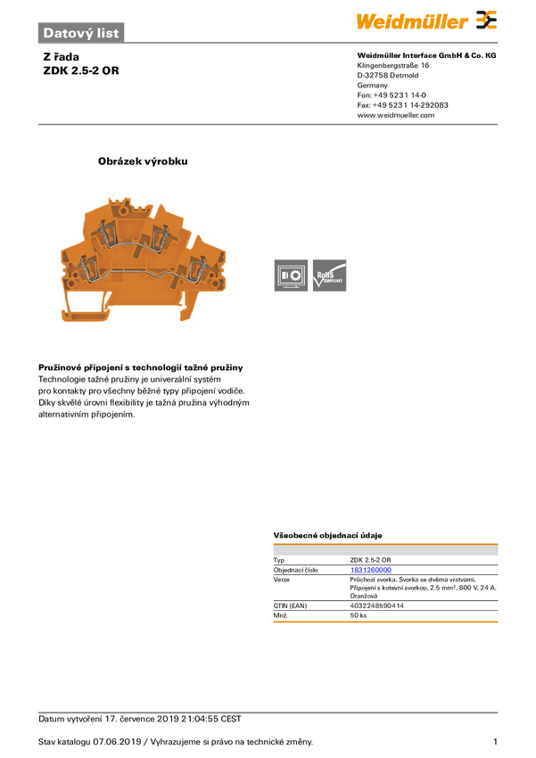 Złączka szynowa przelotowa Weidmüller 2581250000 zacisk push-in 50 szt.