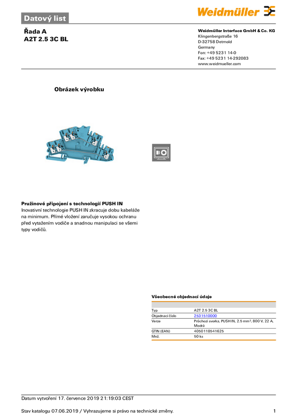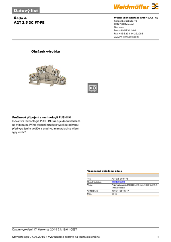 Złączka szynowa przelotowa Weidmüller 2531300000 zacisk push-in 50 szt.