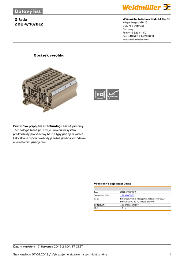 Złączka szynowa przelotowa Weidmüller 1651900000 sprężynowe 10 szt.
