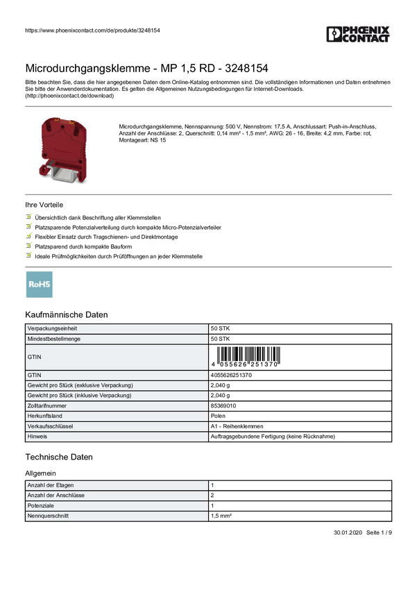 Zacisk przelotowy Micro Phoenix Contact 3248154 zacisk push-in 50 szt.