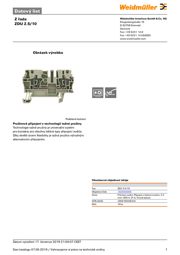 Złączka szynowa przelotowa Weidmüller 1626950000 sprężynowe 10 szt.