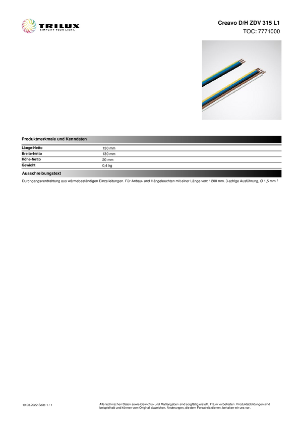 Okablowanie przelotowe . Trilux Creavo D/H ZDV315 L1 7771000, 1 szt.