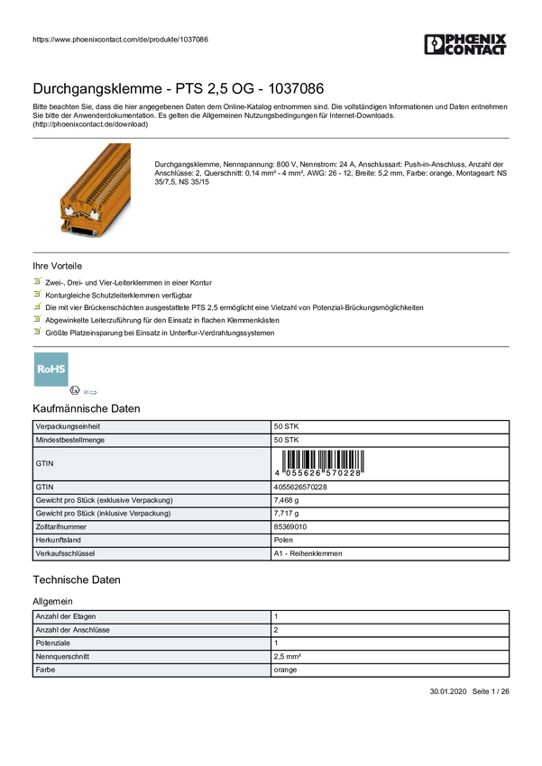 Terminal przepustowy Phoenix Contact 1037086 zacisk push-in 50 szt.