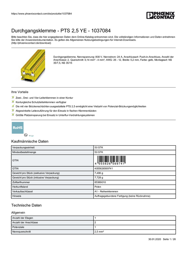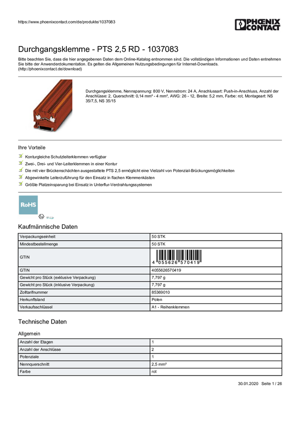 Terminal przepustowy Phoenix Contact 1037084 zacisk push-in 50 szt.
