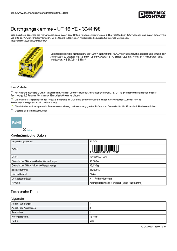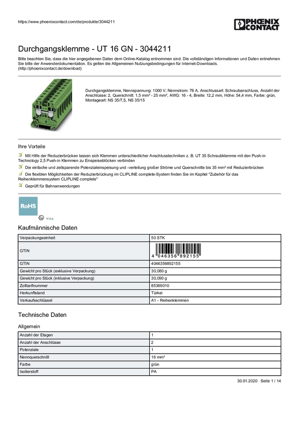 Terminal przepustowy Phoenix Contact 3044198 śrubowe 50 szt.