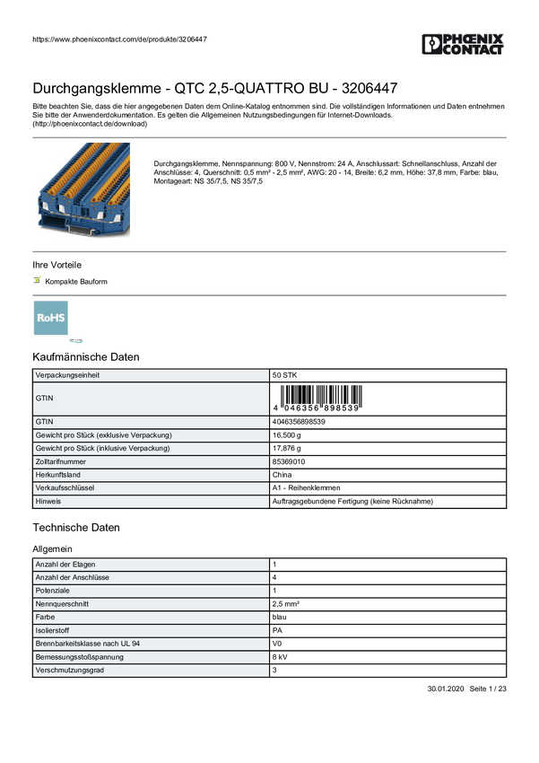 Terminal przepustowy Phoenix Contact 3206447 szybkozłącze 50 szt.