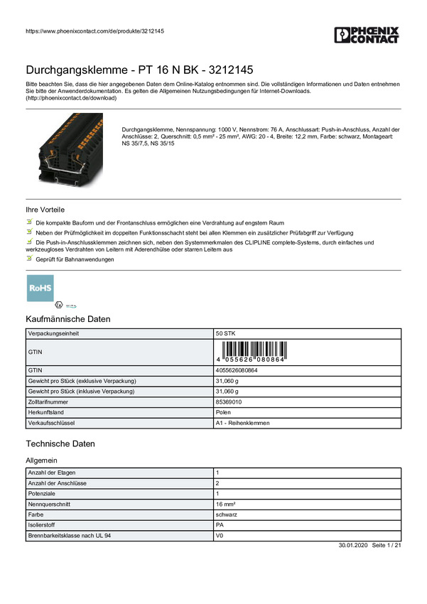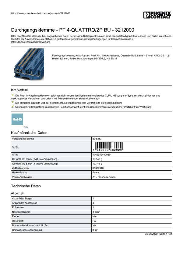 Terminal przepustowy Phoenix Contact 3212000 zacisk push-in 50 szt.