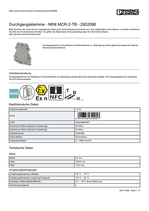 Terminal przepustowy Phoenix Contact 2902068 śrubowe 1 szt.