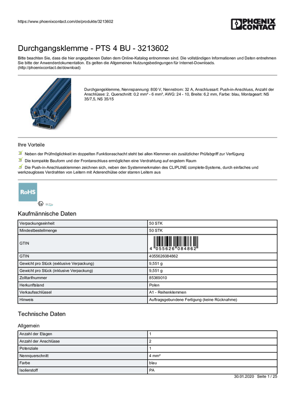 Terminal przepustowy Phoenix Contact 3213602 zacisk push-in 50 szt.