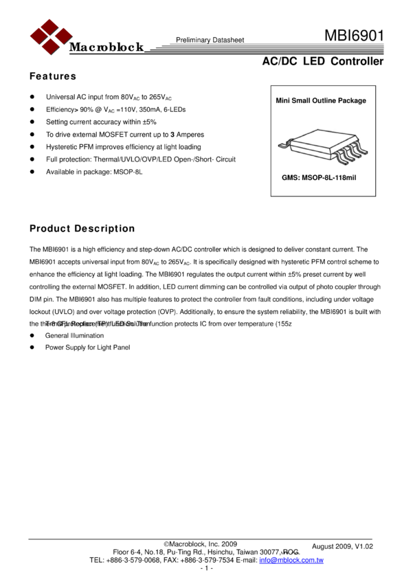 Układ scalony typu przetwornica AC/DC Converter, 80-265V, sprawność>90% /110V,350mAMSOP-8L