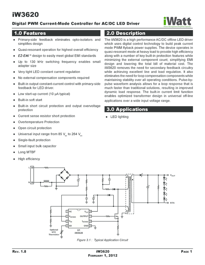 iWATT IW3612-01, cyfrowa przetwornica AC/DC z możliwością ściemniania, moc 8-25W, częstotliwość przełączania do 200kHz, obudowa SO-8