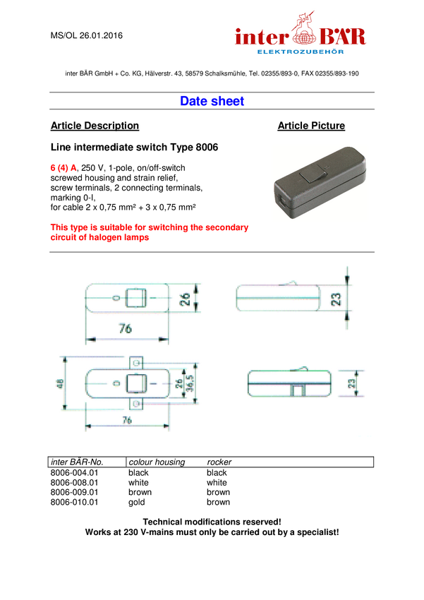 Przełącznik przewodowy interBär 8006-009.01, 6 A, 1 x wył/wł