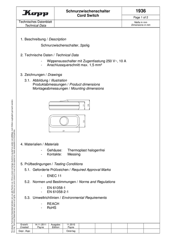 Przełącznik przewodowy Kopp 193606003, 10 A, 1 x wył/wł
