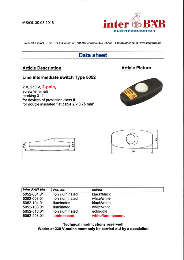 Przełącznik przewodowy interBär 5052-010.01, 2 A, 2 x wył/wł